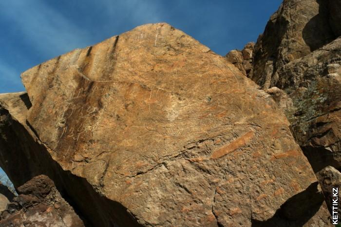 Чуть выше по течению есть еще одна группа петроглифов. В википедии написано, что это кипчакские рунические знаки. Хотя ходит мнение, что это копия каких-то алтайских наскальных рисунков сделанная киношниками для съемок какого-то фильма. И исторического значения не имеет.