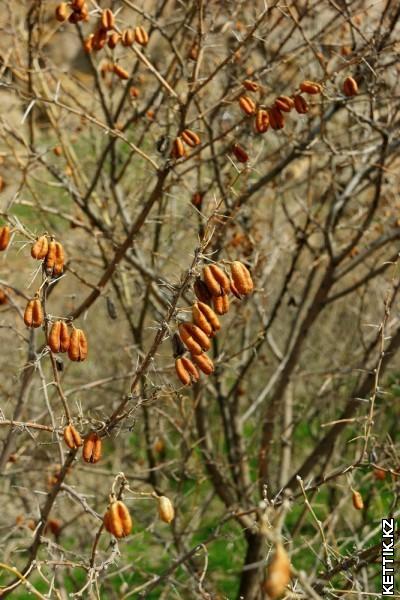 Растительность тут скудная. Все берега заросли вот таким очень колючим кустарником с сухими коробочками, которые очень громко гремят при сотрясении. Такая природная погремушка — очень интересно.
