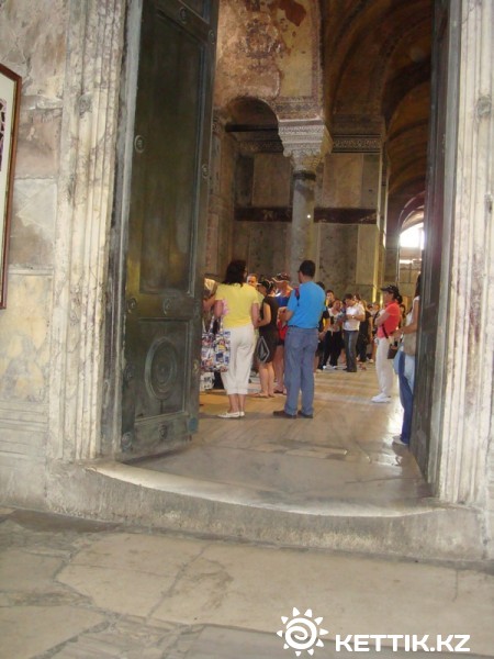 Для строительства храма мрамор доставлялся из разных уголков Византии, Египта и Алжира. Согласно местным легендам, зеленые мраморные колонны были привезены из храма Артемиды в Эфесе, а порфировые — из храма Солнца в Риме. Императорские ворота, по преданию, сделаны из остатков Ноева Ковчега. Через западный вход попадаем в нартекс — крытую галерею с золотыми потолками и росписями. Над императорским воротами — чудесная мозаика 9 века, изображающая Спасителя и коленопреклоненного императора Льва VI.