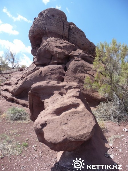 ![]() Как уже говорилось в предыдущей части, на посещение всех достопримечательностей Алтын Эмеля нужно несколько дней, так как территория заповедника огромна и простирается вдоль реки Или на двести километров. Расположение поселка Басчи в самом центре природного парка довольно удачно — отсюда удобно совершать поездки ко всем достопримечательностям. Надо отметить, что даже в зимнее время можно осуществлять экскурсии, потому что зимы здесь малоснежные и не очень суровые. Кроме таких чудес, как Поющий бархан и сакские курганы Бесшатыр, парк также знаменит геологически интересными местами — горными образованиями Актау и Катутау. Они расположены в восточной части парка к югу от хребта Алтын Эмель.