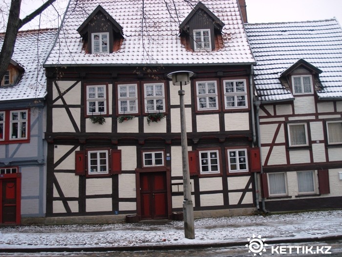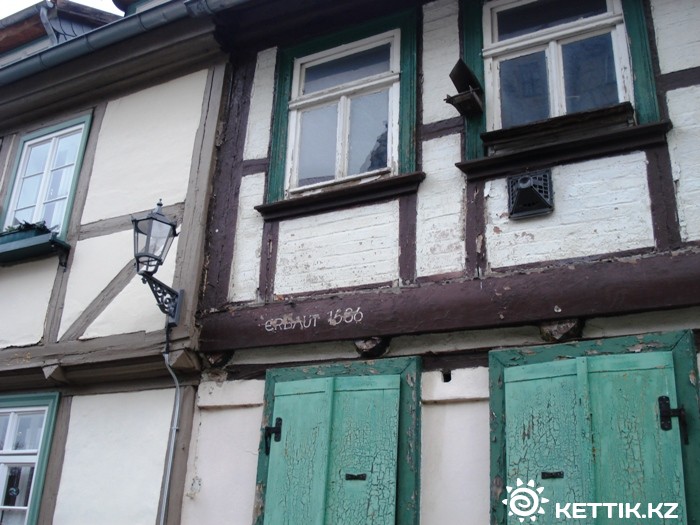Этот похоже, что построен давно и, видимо, еще не реставрировали. Вообще, большинство сохранившихся домов построены в период 30-летней войны (1618-1648) и сразу после нее. Кведлинбергу повезло, его пощадили войны, в том числе и последняя, II Мировая задела только краем. Старинные постройки пострадали больше в послевоенный период. В социалистической Германии мероприятия по сохранению этих архитектурных памятников были сведены к минимуму. Но и планам сноса и строительства на месте исторического центра новых зданий, соответствующих эпохе социализма, не суждено было сбыться все из-за того же безденежья. Кроме того, появились дома с кирпичным заполнением секций
