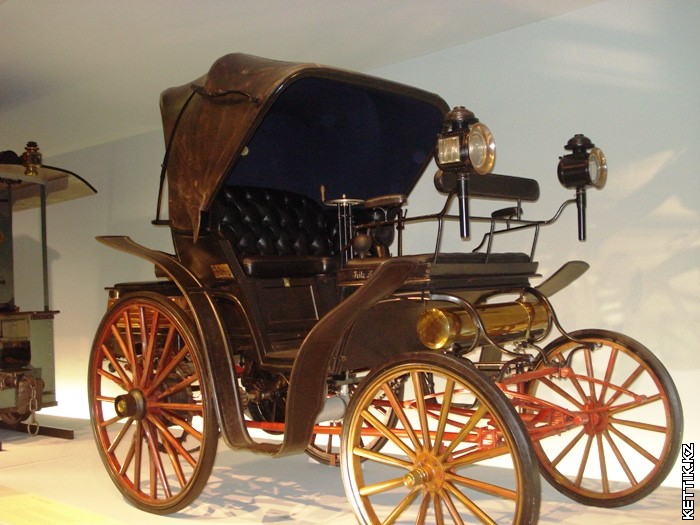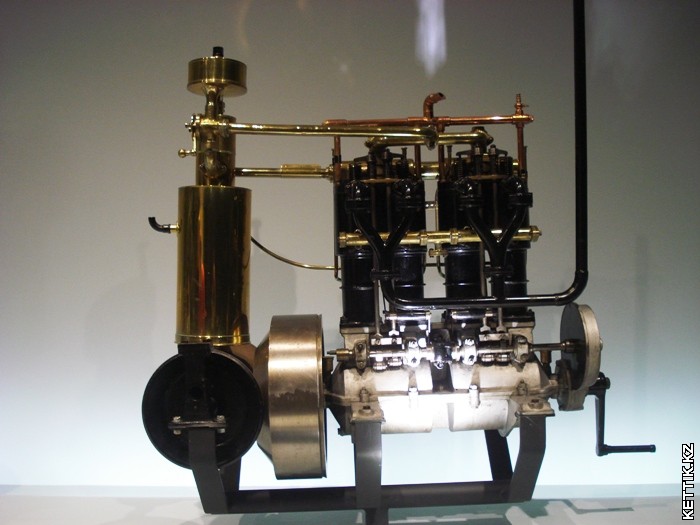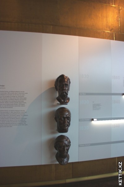 За нашими спинами — административные здания завода. А через дорогу расположено здание Музея — цель нашей поездки. Здание имеет 7 этажей и выглядит очень футуристично. Еще для наглядности пара ракурсов. Внутри здание кажется еще огромней, чем снаружи и еще футуристичнее. Это, например, фойе, а огромная металлическая капсула справа — лифт, поднимающий желающих к началу экспозиции. Прежде, чем подняться к началу экспозиции музея, мы должны были купить входные билеты за 8 евро. Ксюша (уже с чисто немецкой привычкой) спросила про скидки для студентов и улыбчивый молодой человек информировал нас, что скидки есть не только для студентов, но и для людей старше 60-ти лет, если мы имеем при себе документ, подтверждающий возраст. Мы с готовностью достали свои голубые паспортины, но молодой человек не стал их смотреть, сказал, что верит нам и выдал билеты за полцены, а еще снабдил аудиогидами на русском языке. Теперь мы в полной готовности приступить к осмотру музея. По выходу из лифта на 7-ом этаже, нашему взору предстала лошадь. На постаменте красовалось изречение кайзера Вильгельма II, которую я вынесла в эпиграф о преходящем значении автомобиля. Возможно, эта фраза и была когда-то актуальна, но к середине осмотра экспозиции понимаешь, что сейчас это лишь сарказм. Чтобы проникнуться атмосферой Штутгарта времен изобретения первого автомобиля, начнем со снимков нескольких диарам. Cкульптурные портреты знакомят нас с основателями автомобильного бренда, известного сейчас во всем мире и очень популярного у нас, в Казахстане. Готтлиб Даймлер (1834-1900 г.г.) — сын пекаря, окончил Политехнический институт в Штутгарте. В 1863 году Даймлера судьба сводит с Вильгельмом Майбахом (1846-1929 г.г.) — воспитанником сиротского приюта при фабрике "Брудерхауз" в Ройтингене, который получил профессию чертежника и конструктора. С тех пор Даймлер и Майбах работали вместе. В 1882 году они переезжают в Штутгарт, покупают дом в Бад-Канштатте, организуют мастерскую в садовой оранжерее и начинают изобретать. В 1885 году — первый бензиновый двигатель.