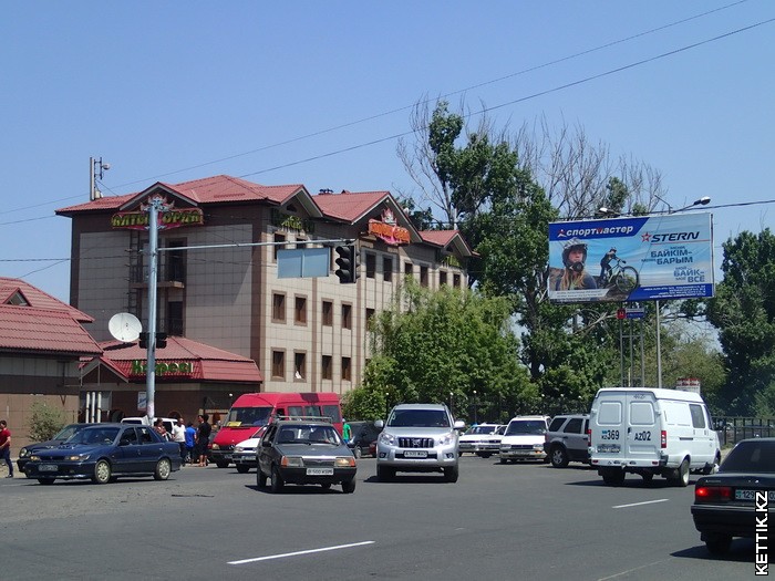 Возле базара Алтын Орда я оказался в 12:47. Если говорить о трассе, то это самый неприятный участок пути. Не сложный, но неприятный. На дороге пробка, обочины заставлены машинами, тротуары запружены народом. Пыльно и шумно.