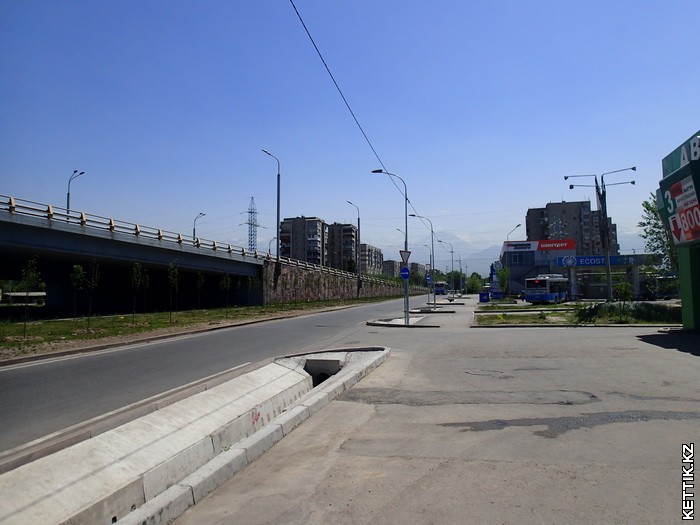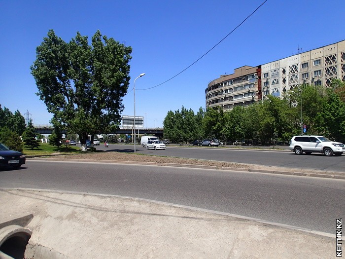 И отсюда же, с Тлендиева-Раимбека начинается самый удобный участок пути в городе. По разделительной полосе идет широкая ровная дорожка, на которой никого нет. Ехать по ней — одно удовольствие. Отсюда я стартанул ровно в 14:00