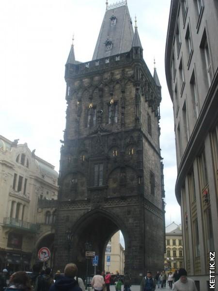 Это пороховая башня, через ворота которой мы выходим на площадь Республики. Строить ее начали в 1475 году, башня должна была защищать одни из главных ворот при въезде в город, поэтому строилась со всякими украшениями в готическом стиле, но еще до окончания строительства возведение ее, как фортификационного объекта, потеряло смысл. Чтобы здание можно было как-то использовать, городские власти возвели временную крышу и хранили в ней порох. Достороена в неоготическом стиле в 1878-1886 годах. Теперь в ней музей и смотровая площадка для туристов.