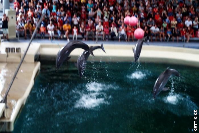 До начала представления они плавают по кругу и периодически выпрыгивают из воды. Правда не высоко.