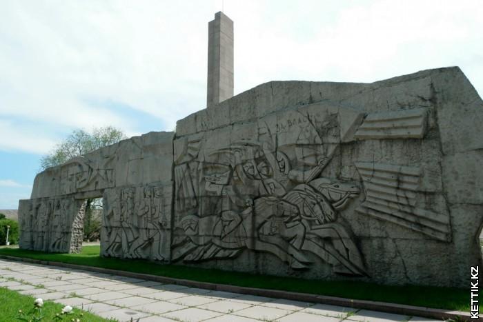 На гранитной плите на русском и на казахском языках написано: "Памяти героев-комосомльцеы Гражданской войны посвящается"