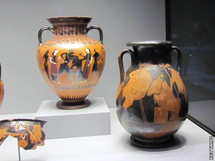 В "Греческом зале" больше всего витрин с посудой из керамики, но здесь еще и серебряные чаши для вина.