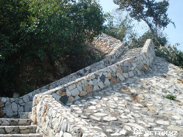На вершине холма была площадка для разворота автомобилей, элитные дома за оградами, видимо, где-то была и подъездная дорога, но мы не стали рисковать и спустились вниз, к той, которая уже нанесена на карту. Дорога отвернула от моря и пошла ощутимо в гору. Прогулка не стала такой легкой и приятной, солнце припекало, мозги начинали закипать и, видимо, поэтому мы забыли про фотоаппарат. А запечатлеть было что. Ниже дороги, у подножия холма стояли многоэтажные жилые дома, окруженные бассейнами, спортивными площадками, газонами и цветниками, но больше всего меня поразила изгородь, которая отделяла кондоминимумы от дороги. Это просто находка дизайнера: невысокие столбики, сложенные из рваного камня, а между ними причудливо извиваются стебли цветущих бугенвиллий. Но, к сожалению, забыли "сохранить красоту для потомков" :), пока не зашли в относительную тень. Здесь тоже красиво