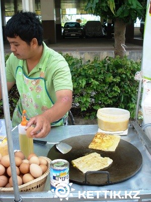 поливается сгущенкой и съедается, но если честно, для меня сочетание банана с яйцом — не очень… Цена этого лакомства на плакате — 30 батт. А вот и заведение посолиднее, судя по указателям, очень популярное у русскоязычных туристов, особенно наше направление